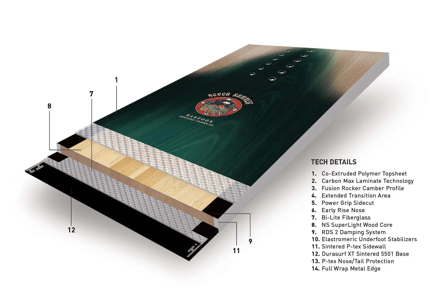 A combination of durable and lightweight woods create an unmatched strength to weight ratio. The worlds best snowboard fibreglass gives Never Summer boards their superior strength, edge hold and durability. Damping along the edges, underfoot and at the tip and tail provide stability at high speeds, and absorb vibrations.