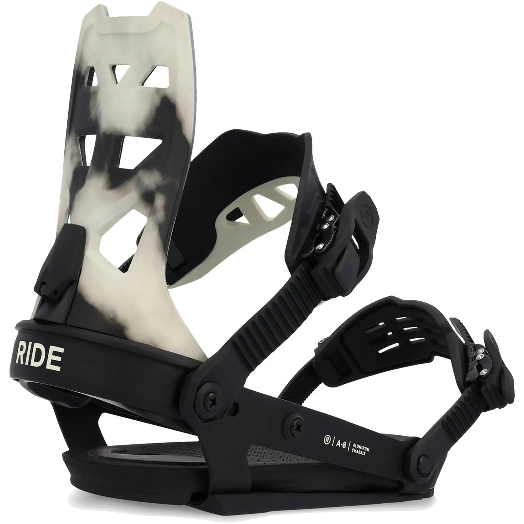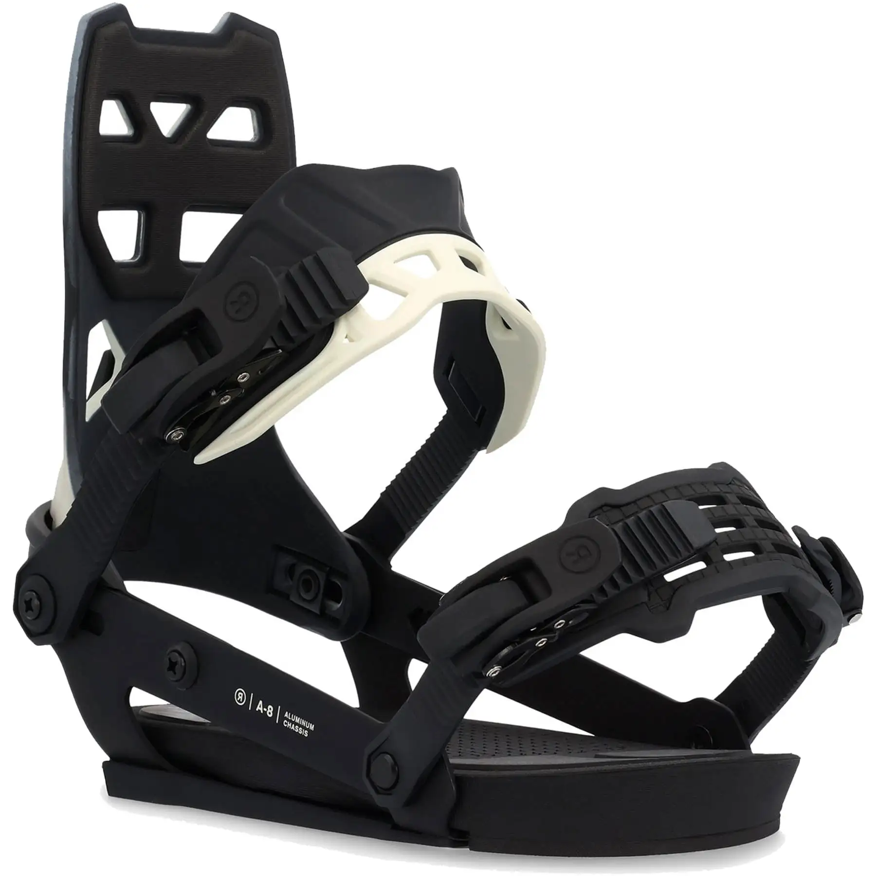 The 2023 Ride A-8 Snowboard Binding specifically engineered for optimal all-mountain performance, catering to snowboarders who demand top-notch performance from their bindings. The A-Series aluminium chassis offers reactive flex and power transfer with less rigidity, providing a more responsive ride. The binding is designed to be both precise and aggressive, providing the rider with the necessary tools to push their snowboarding abilities to the next level. Featuring a Reversible Ankle Strap, the A-8 provides two different riding positions, allowing for a more customized experience. The rider can opt for different a stiffer feel by placing the stiff part of the strap on top or increase flexibility and lateral movement by swapping the straps so that the soft part is on top.